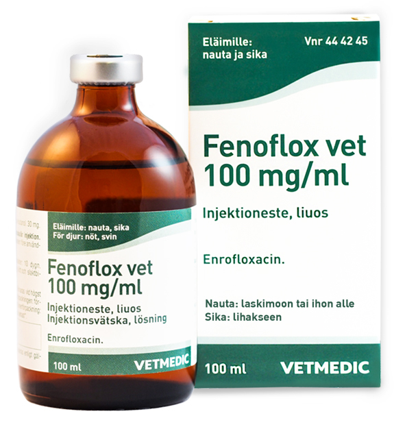 Mikrobilääke naudalle ja sialle Vaikuttava aine: enrofloksasiini Reseptilääke Pakkauskoot: 100 ml | ![]() |