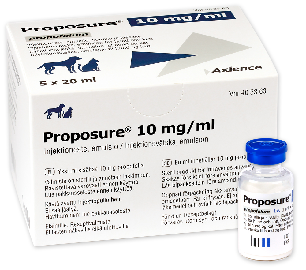 Lyhytvaikutteinen yleisanestesia-aine koiralle ja kissalle Vaikuttava aine: propofoli Reseptilääke Pakkauskoot: 5 x 20 ml | ![]() |